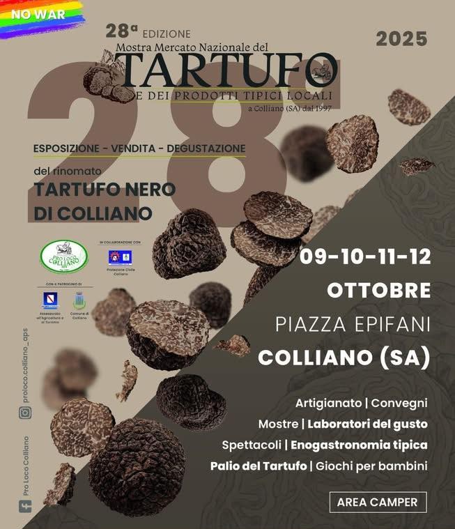 Ritorna l’evento più atteso dell’anno a Colliano, in provincia di Salerno. Dal 9 al 12 ottobre 2025 si terrà infatti una nuova edizione della Mostra Mercato Nazionale del Tartufo e dei prodotti tipici locali. Oltre a poter acquistare il tartufo nero e i prodotti locali si potranno anche degustare le pietanze tipiche della cucina locale.