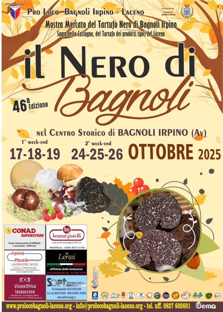 Giunta alla sua 46° Edizione la Mostra Mercato del Tartufo Nero di Bagnoli Irpino è ormai un appuntamento fisso del panorama di eventi di ottobre in Campania. La festa si terrà in due week end dal 17 al 19 e dal 24 al 26 ottobre 2025. Protagonista della kermesse enogastronomica, organizzata dalla Pro Loco Bagnoli Laceno, sarà il Tartufo Nero di Bagnoli e le specialità bagnolesi come i funghi porcini, i prodotti caseari, le castagne e tanto altro ancora. La manifestazione sarà l’occasione per visitare il borgo di Bagnoli Irpino, i suoi monumenti storici e scoprire le bellezze naturali e paesaggistiche del Laceno.