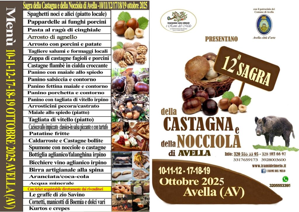 Avella torna ad ospitare la Sagra della Castagna e della Nocciola Avellana, dal 10 al 12 ottobre e dal 17 al 19 ottobre 2025. La Sagra si svolge nel centro storico chiuso al traffico in Corso Vittorio Emanuele, cibo, musica e stand.