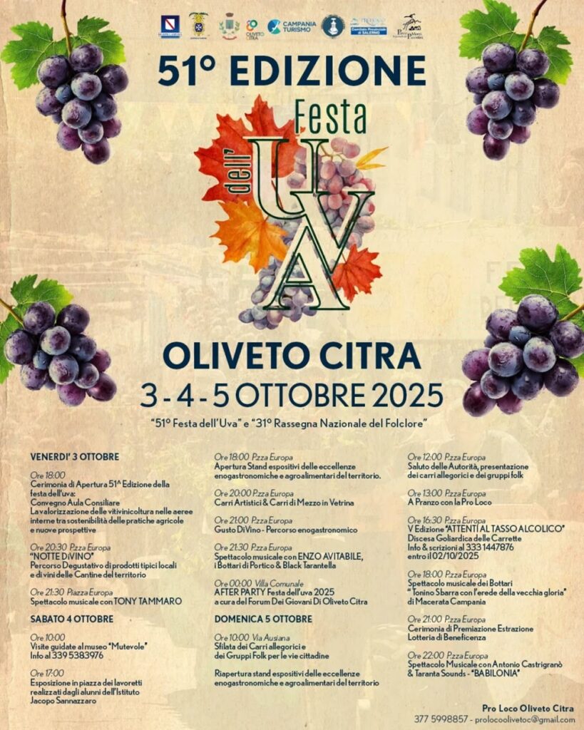 Ecco l’intero programma della 51° edizione della Festa dell’Uva di Oliveto Citra, in programma da venerdì 3 a domenica 5 ottobre 2025. Tradizione, cultura, musica, divertimento e buon cibo. La manifestazione è organizzata dalla locale Pro Loco.