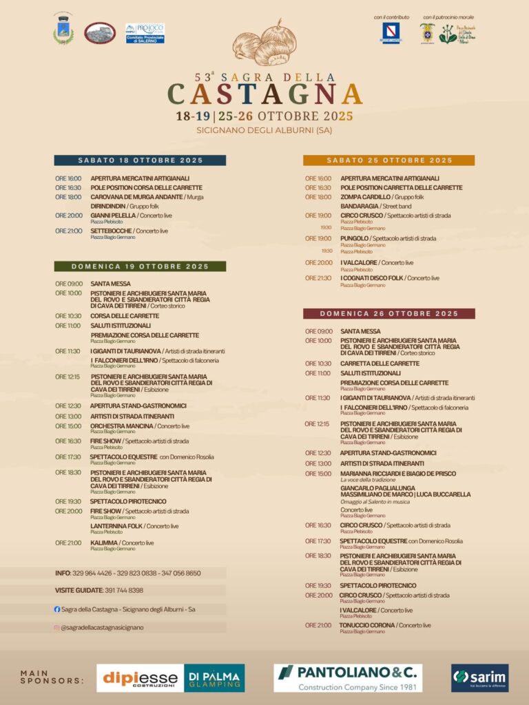 Tradizione, arte, spettacoli, cultura, divertimento e tanto buon cibo sono le peculiarità della “Sagra della Castagna”, l’evento di Sicignano degli Alburni, in provincia di Salerno, che nel 2025 celebra la sua edizione numero 53 in uno scenario meraviglioso alle pendici dei Monti Alburni.