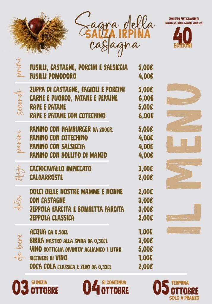 Edizione numero 40 per al sagra della Castagna a Salza Irpina. Il borgo in provincia di Avellino è pronto ad accogliervi con un ricco programma di eventi, musica e soprattutto piatti della tradizione locale. Appuntamento da venerdì 3 a domenica 5 ottobre 2025. Domenica gli stand enogastronomici saranno aperti solo a pranzo, mentre venerdì e sabato la sagra inizierà a partire dalle ore 20.00.