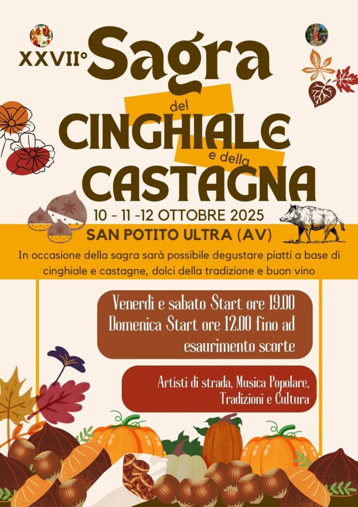 Torna l’atteso appuntamento con la Sagra del Cinghiale e della Castagna arrivata ormai alla sua XXVII° edizione, presso il borgo di San Potito Ultra. Ogni angolo prenderà vita, le strade del paese si coloreranno di luci, voci e persone; ma soprattutto di buon cibo accompagnato da buona musica e ottimo vino. L’evento si svolgerà nei giorni del 10-11-12 ottobre (venerdì e sabato sera, domenica da pranzo fino ad esaurimento scorte) sarà possibile raggiungerci per gustare gli ottimi piatti ed il famoso tronchetto di castagne da guinness, nel menù della sagra la tradizionale brace di maiale e cinghiale, gli scialatielli con ragù di cinghiale, e gli scialatielli con zucca, le caldarroste, il caciocavallo ‘mpiccato, vino paesano e dolci della tradizione popolare fatti dalle massaie del paese.