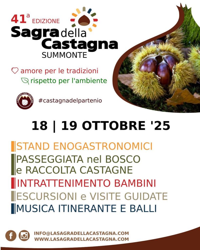 Sabato 18 e domenica 19 ottobre 2025, il borgo medioevale di Summonte, in provincia di Avellino, si tingerà dei colori dell’autunno con la 41esima edizione della “Sagra della Castagna”, tra allegria, musica, balli e giochi popolari.