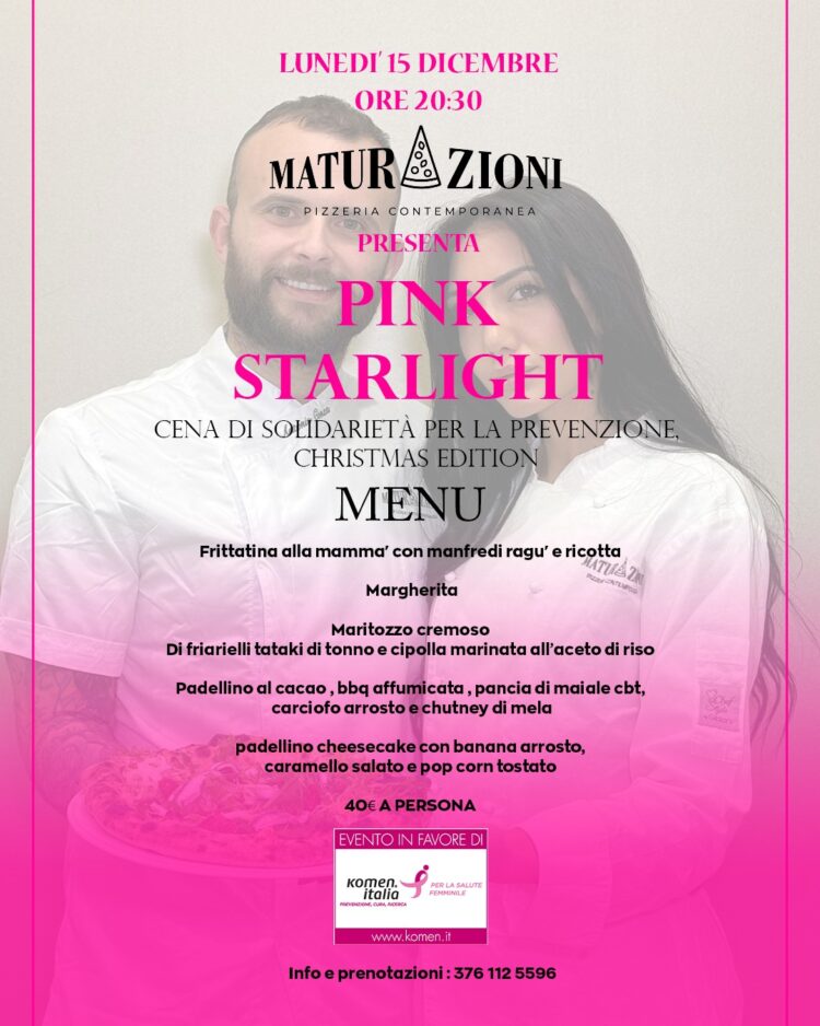Maturazioni celebra il Natale con Pink Starlight, una cena di solidarietà dedicata alla prevenzione e al sostegno delle donne che affrontano un tumore. L’evento benefico, in favore di Komen Italia, si terrà lunedì 15 dicembre alle ore 20.30 presso Maturazioni Pizzeria, in via S. Leonardo Zabatta 105 a San Giuseppe Vesuviano (NA).