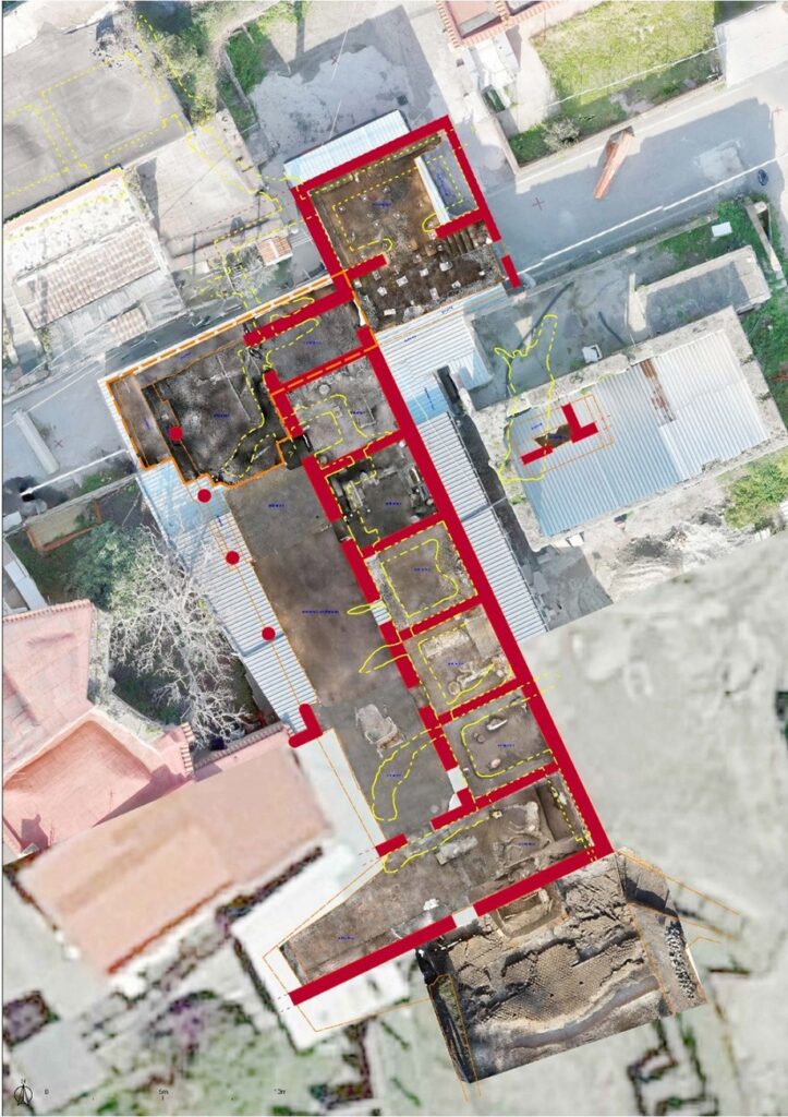 Gli ambienti indagati al piano terra hanno restituito il calco dell’anta di una porta, composta da due pannelli rettangolari e con ancora le borchie in ferro, probabilmente una delle ante della porta a doppio battente che dal portico conduceva al corridoio che terminava all’ingresso del sacrario. Un secondo calco sembra rientrare nella sfera degli attrezzi agricoli, forse un aratro a spalla o una stegola, ovvero l’elemento che serve a guidare un aratro trainato da animali.