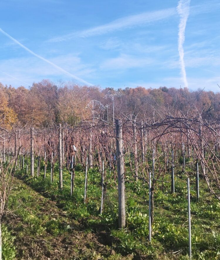 Meravigliosamente inserita tra i filari della vigna Bellaria, l’installazione è stata pensata proprio in relazione al territorio. Infatti precisa l’Artista che “matrice fondamentale del progetto è la tradizione vignaiola che per decenni ha rappresentato la valutazione dello stato di salute della vigna: quella di piantare una rosa in testa al filare. La rosa era un fiore ricettore: più sensibile e delicata della vite, si ammalava prima della vigna e dava quindi segnali urgenti di intervento, come fosse un fiore-sensore-antenna. Da qui l’idea di intendere il fiore come paradigma di monitoraggio della qualità di un contesto e di un paesaggio”. Le sue cinque rose sono in realtà dei racemi, lo stelo da cui partono i peduncoli del fiore, sono le strutture portanti dei fiori. Ispirati a disegni di una enciclopedia botanica, questi cinque schizzi sono stati proiettati su fogli e ricalcati, per poi essere riprodotti in ferro zincato a caldo. È un disegno lineare, quasi infantile, però essenziale e di forte impatto. Le sculture, cave e filiformi, permettono una permeabilità della luce e dell’aria, richiamando l’eliotropismo tipico dei fiori. Mentre quelli orientano la propria crescita seguendo il calore del sole, le sculture di Alberto Tadiello si aprono verso l’azienda vitivinicola, per la quale sono stati pensati.