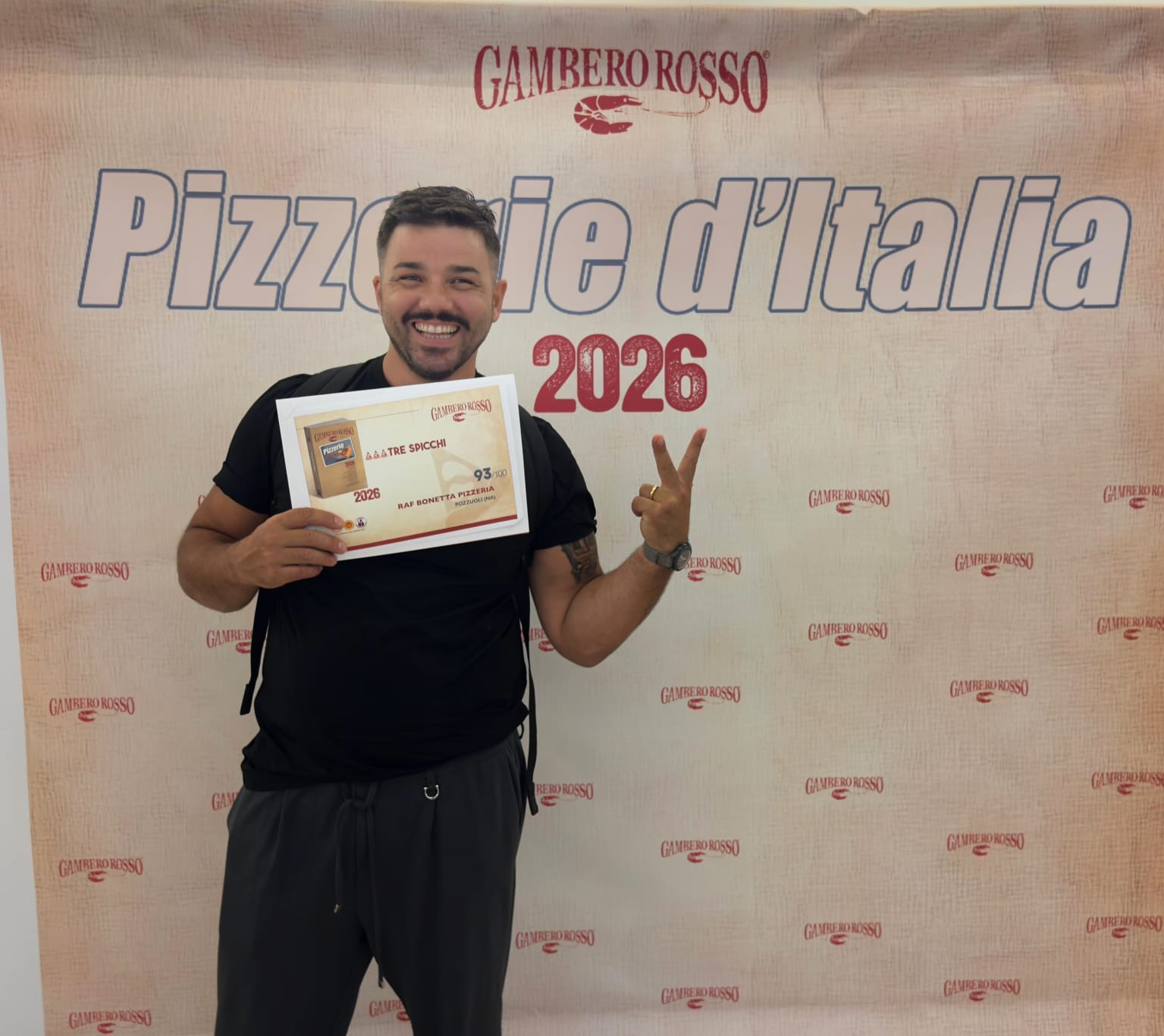 Un traguardo straordinario a testimonianza della maestria di Raffaele Bonetta nel campo della pizza celebrato al Palacongressi della Mostra d’Oltremare di Napoli dove si è svolta la tredicesima edizione della Guida Pizzerie d’Italia Gambero Rosso, l’evento che riunisce ogni anno i più grandi maestri pizzaioli italiani. Le pizzerie recensite in questa edizione sono state 816, in aumento rispetto all’anno scorso e il conferimento dei Tre Spicchi rappresenta il massimo livello di eccellenza assegnato dalla rinomata guida del Gambero Rosso per la qualità delle pizze. Il voto di 93\100 dato dalla giuria Gambero Rosso, consacra Bonetta tra i migliori pizzaioli d’Italia, dimostrando come la passione, la cura degli ingredienti e l’innovazione possano portare rapidamente a un successo di rilievo nel panorama gastronomico italiano.