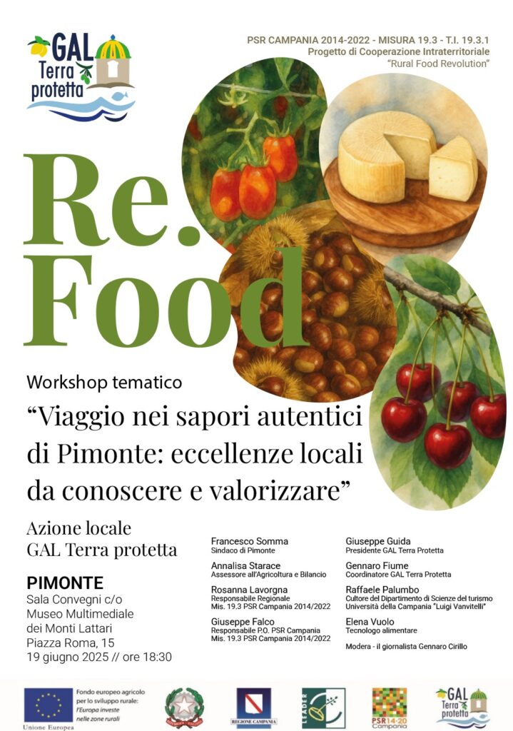 Sarà Pimonte, con il suo straordinario patrimonio agroalimentare, ad accogliere il primo workshop tematico del progetto Rural Food Revolution – RE FOOD, promosso dal GAL Terra Protetta nell’ambito della Strategia di Sviluppo Locale del PSR Campania 2014–2022. L’appuntamento è per giovedì 19 giugno, alle ore 18.30, presso la Sala Convegni del Museo Multimediale dei Monti Lattari in piazza Roma, 15.