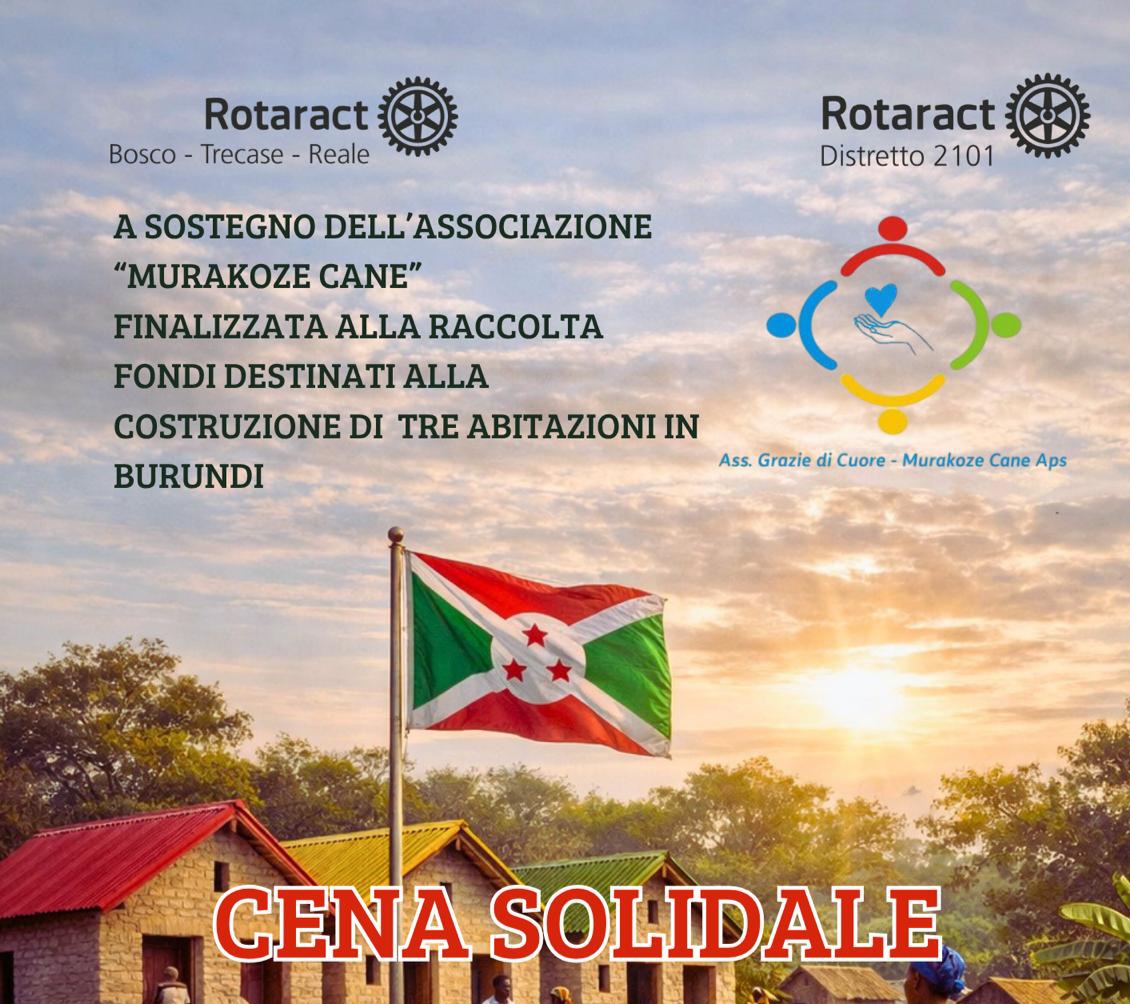 Un aiuto concreto per il Burundi con una serata all’insegna della solidarietà e dell’impegno concreto. Il Rotaract Club Bosco–Trecase–Reale organizza una cena benefica per sostenere l’associazione “Murakoze Cane”, con l’obiettivo di raccogliere fondi destinati alla costruzione di tre abitazioni in Burundi. Un piccolo gesto che può fare una grande differenza. Appuntamento martedì 12 Maggio, alle 20, presso l’stituto Alberghiero ‘Graziani-Cesaro-Vesevus’ a Torre Annunziata