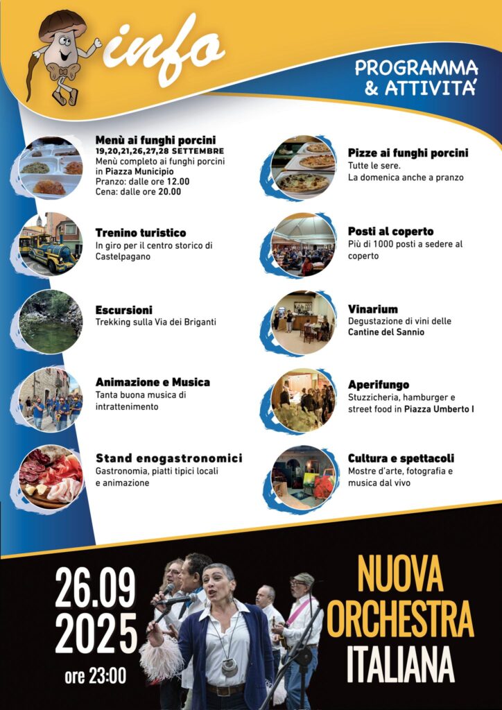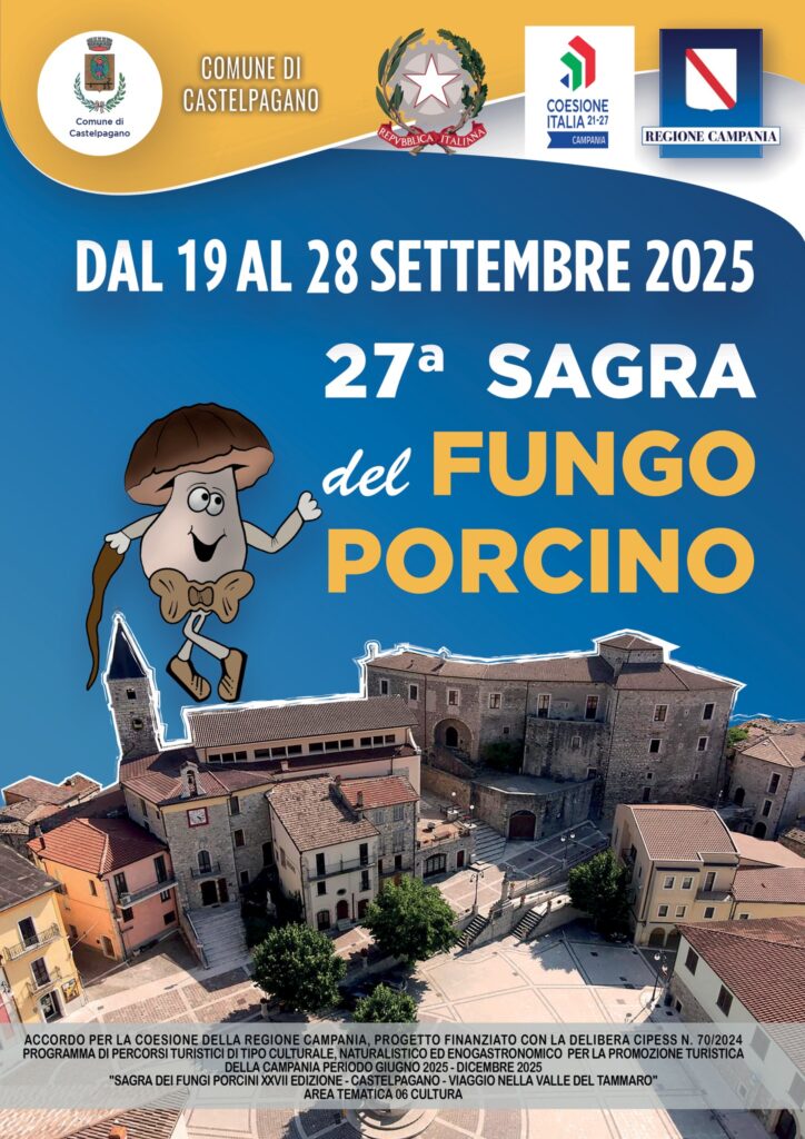 Castelpagano, borgo in provincia di Benevento, è pronto ad ospitare l’edizione numero 27 della tradizionale “Sagra del Fungo Porcino“, la kermesse gastronomica che richiama, nella cittadina, oltre 20.000 visitatori nel periodo più propizio alla raccolta dei funghi porcini, presenti nei numerosi boschi del territorio.