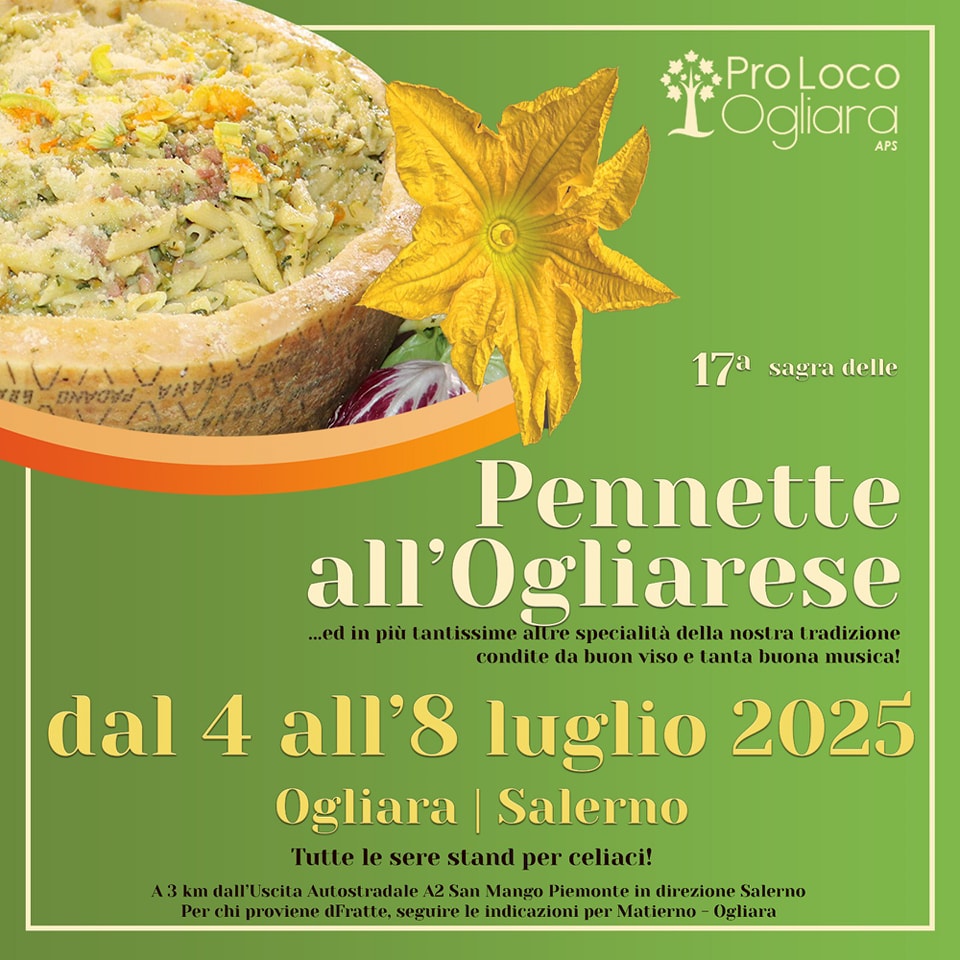 La manifestazione si terrà dal 4 all’8 luglio 2025 ad Ogliara. Assoluto protagonista sarà il piatto tipico di questa frazione servito rigorosamente nel tegamino, che ogni ospite può portare a casa e riutilizzare, ideale per accogliere un trionfo di pasta, condita con fiori di zucca, zucchine, guanciale e grana.