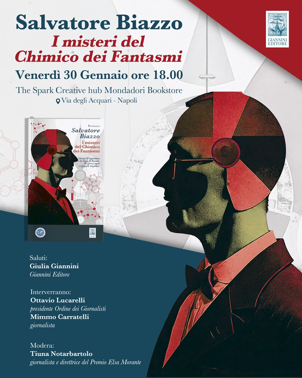 Una presentazione da non perdere quella del romanzo storico “I misteri del Chimico dei Fantasmi”di Salvatore Biazzo, pubblicato dalla Giannini Editore nella collana Romanzi dai Cinque Continenti. L’evento si terrà venerdì 30 gennaio alle ore 18 pressola libreria The Spark Creative hub Mondadori Store, via Degli Acquari, Napoli. Dopo i saluti di Giulia Giannini della Giannini Editore, dialogheranno con l’autore: il presidente dell’Ordine dei Giornalisti Ottavio Lucarelli e il giornalista Mimmo Carratelli. Modererà l’evento Tiuna Notarbartolo, giornalista e direttrice del Premio Elsa Morante.