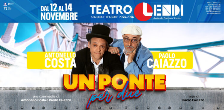 Paolo Caiazzo torna a stupire il pubblico con una commedia forte, dallo spirito ironico e riflessivo. Il Teatro Lendi si prepara ad aprire la nuova stagione teatrale con una commedia avvincente scritta da Antonello Consta e Paolo Caiazzo che dirige una commedia brillante dal ritmo serrato e dai toni profondamente umani. La sala, diretta da Francesco Scarano, si appresta a ospitare, dal 12 al 14 novembre alle ore 21:00, la commedia “Un ponte per due”, una riflessione ironica sulle fragilità contemporanee, tra crisi personali e ossessione per i social, raccontata con il talento di due grandi protagonisti della comicità italiana, per la prima volta insieme in scena. Un incontro atteso e sorprendente tra due stili diversi, ma complementari: da un lato l’estro visivo, la comicità brillante e surreale di Antonello Costa, attore completo capace di passare con disinvoltura dalla parodia al mimo, dal canto alla macchietta; dall’altro, l’ironia sottile, pungente e profondamente napoletana di Paolo Caiazzo, volto amatissimo del cabaret e della TV, autore e interprete di personaggi memorabili.