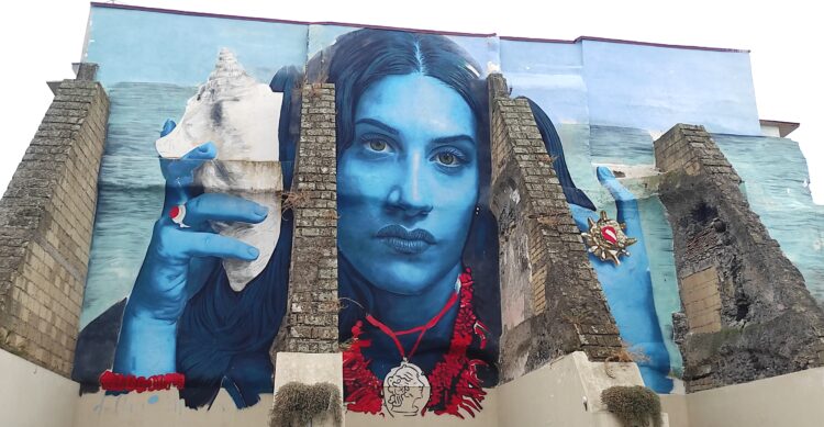 E così, con l’arte, ci si riappropria dei propri spazi, delle proprie tradizioni e della propria cultura che, a Torre del Greco, affonda le radici nella lavorazione del corallo e dei cammei. Un tesoro che viene dal mare, in un luogo in cui già dal XVII secolo, più di 200 imbarcazioni erano dedite alla raccolta di spugne, coralli e conchiglie. Lo sa bene Partenope, (rappresentata nel murales), sirena azzurra come il suo elemento che nasce come una Venere tra le onde, con le sue mani ingioiellate porta all’orecchio una enorme conchiglia ad ascoltare le voci di un passato glorioso quando Torre del Greco era considerata la “spugna d’oro” dell’epoca borbonica e divenne simbolo di un artigianato d’eccellenza.