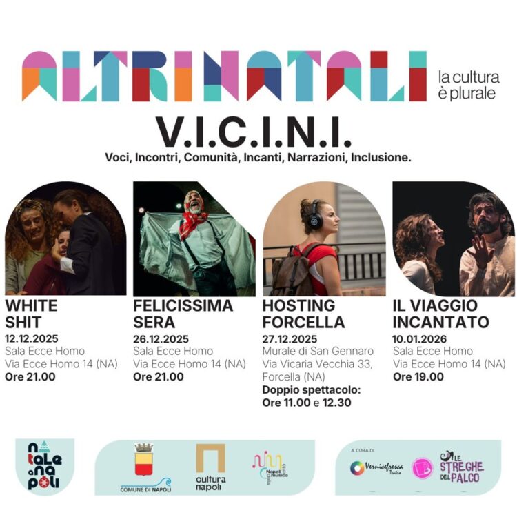 Inizia venerdì 12 dicembre V.I.C.I.N.I. – Voci, Incontri, Comunità, Incanti, Narrazioni, Inclusione, la rassegna teatrale promossa nell’ambito del progetto Altri Natali dal Comune di Napoli. Vernicefresca Teatro, Coffee Brecht e Le Streghe del Palco Srlsi riuniscono in quattro appuntamenti in cui il teatro diventa condivisione e partecipazione.