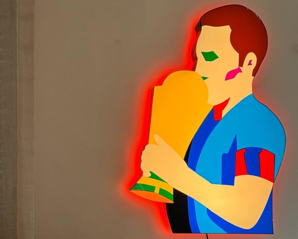 Esposte trenta opere del “pittore della luce”, noto per aver dato vita a una peculiare forma di scultura luminosa, dove luce e colore si fondono in un’esplosione di gioia e nostalgia. Tra queste: “Campione del mondo” con l’effige di Fabio Cannavaro, il celebre “Floating kiss”, Batman”, “The Beatles”, “James Bond”. Lodola è uno dei principali esponenti della nuova figurazione italiana e della pop art contemporanea. Il suo stile è immediatamente riconoscibile per le figure dinamiche, i colori vivaci, le sagome luminose in plexiglass e materiali industriali. Sì cena tra opere che raccontano un immaginario fatto di cinema e icone pop, musica, danza, amore.